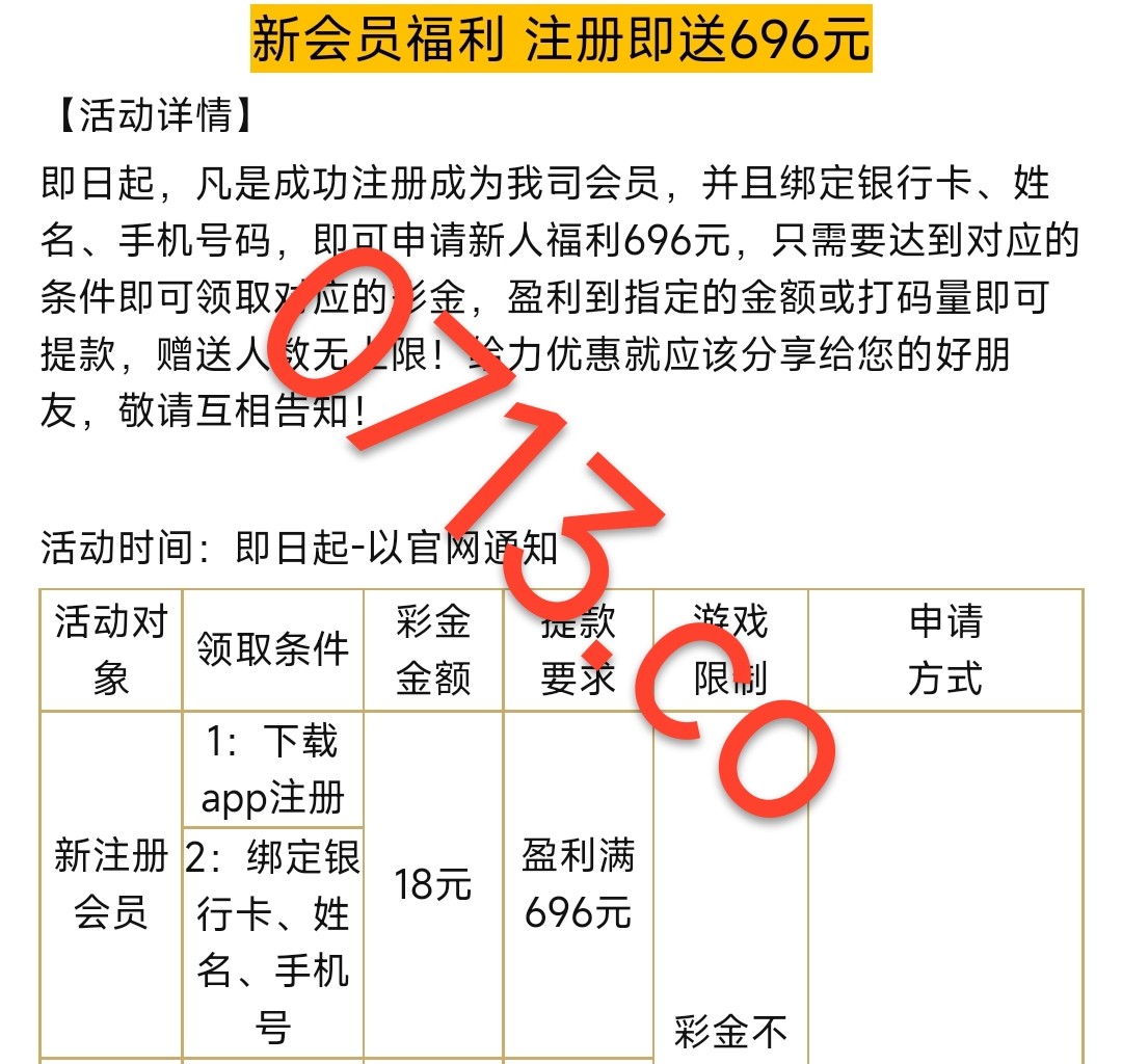新用户注册绑卡绑定手机号申请18彩金打到696提款,有游戏限制