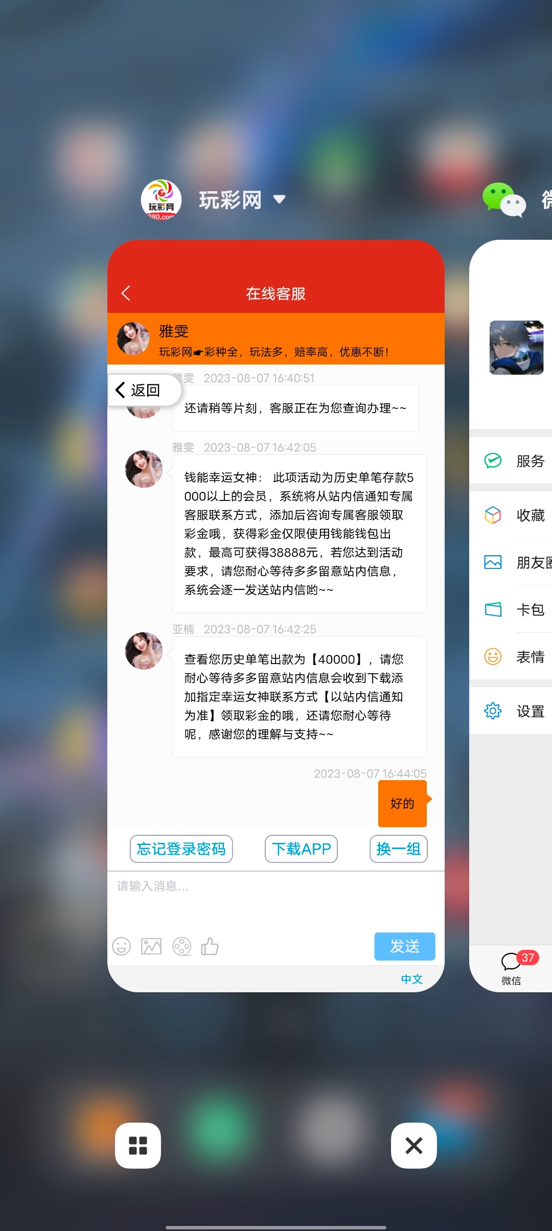 谁有380玩彩0和224大众的回馈客服截图,来一个出款团,现在只要达标有客服截图会送。