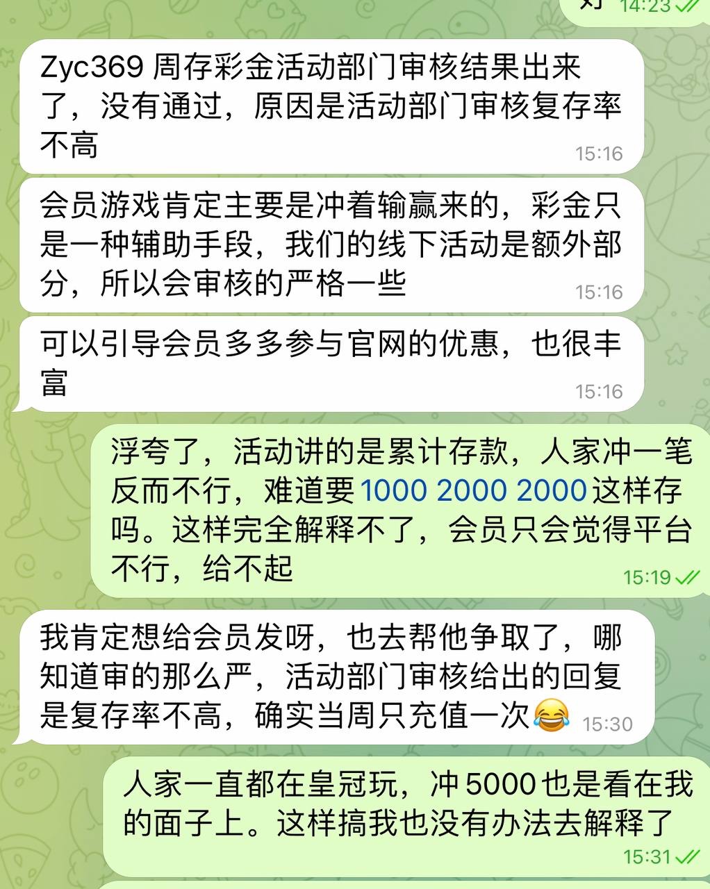 曝光一下垃圾平台#杏彩体育,卡会员周存彩金,卡代理佣金。会员上周存款5000,参加周存活动,结果说人家不复存,彩金不给发,人家前两个月輸一两万,惠州公司流水每个月两千万的真实玩家。好像不一直充钱会员都是虚假会员。说说存款,会员充值一直看不到卡号,充值一直找我拿卡。说说提款,提款还要扣5%的押金,这个操作直接把新增恶心到了,开的新增充值了两三次就没玩了。结果到发佣金的时候,说是刻意凑活跃,卡我佣金。就这样的一个垃圾平台,你让我怎么让新增一直玩。真的是把我恶心到了。各位玩家代理#避坑