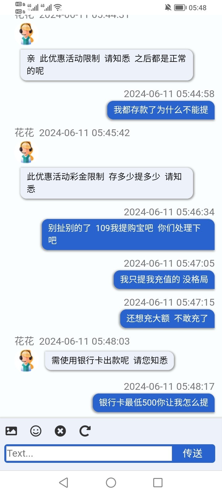 打电话送18 提款109 不让提  说让充109才能提  充值以后还是不让提 又让提供手持身份证 提供了也不让提又说只能提银行卡   银行卡最低500提  打到500也不让提  说我存款109只能提109 畜牲  合着我只能输一分不能赢