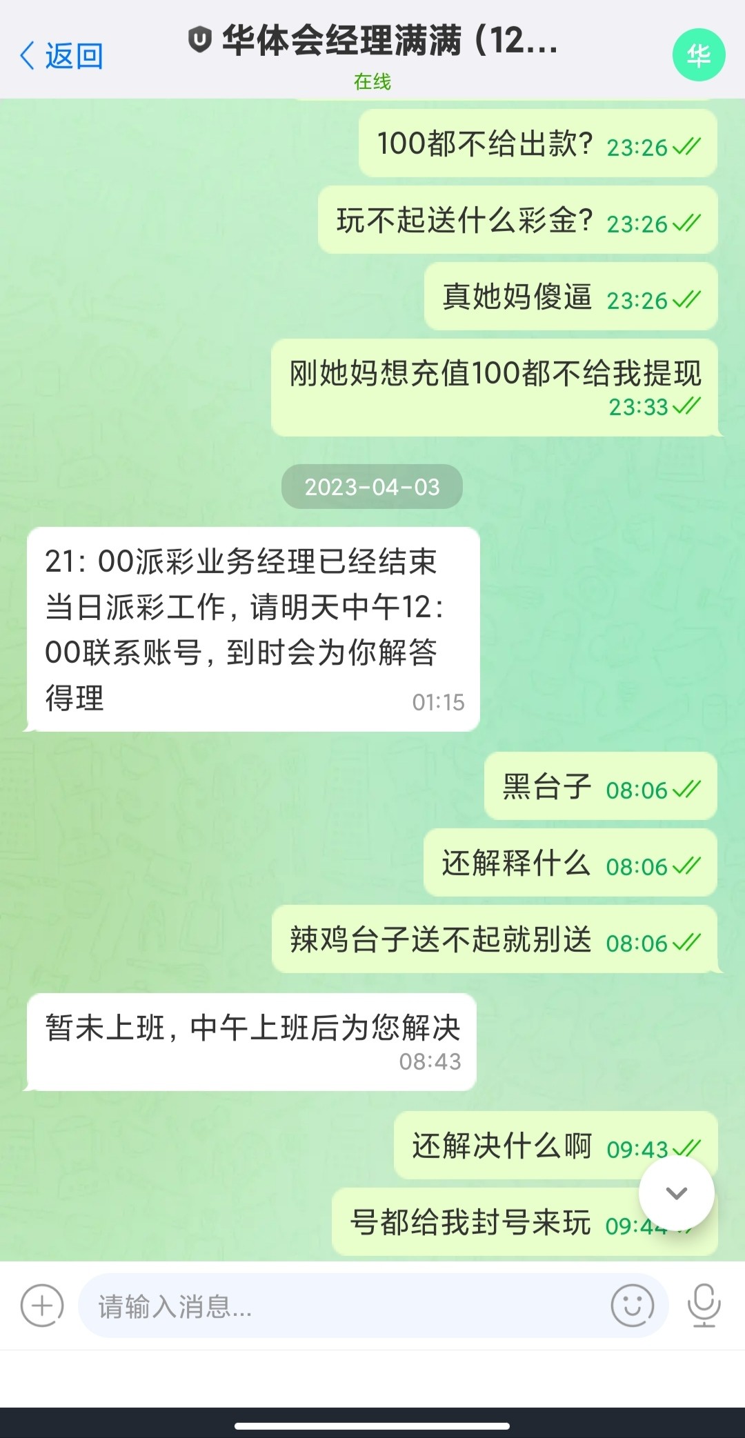 辣鸡华体会特邀打上600提现100直接封号傻逼客服经理畜牲东西避雷吧玩不起