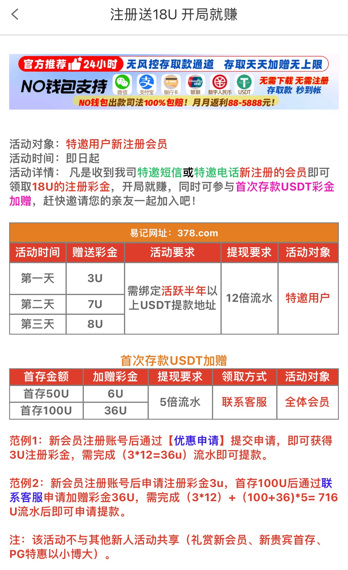 注册绑定活跃半年以上USTD提款地址是特邀自动送,18U分三天送12倍流水