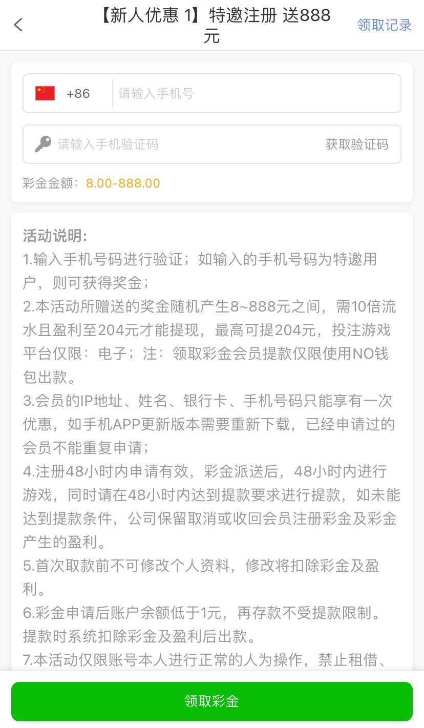 注册完善资料优惠里自助领取,10倍流水,最高低204提款,仅限电子,仅限NO钱包取款