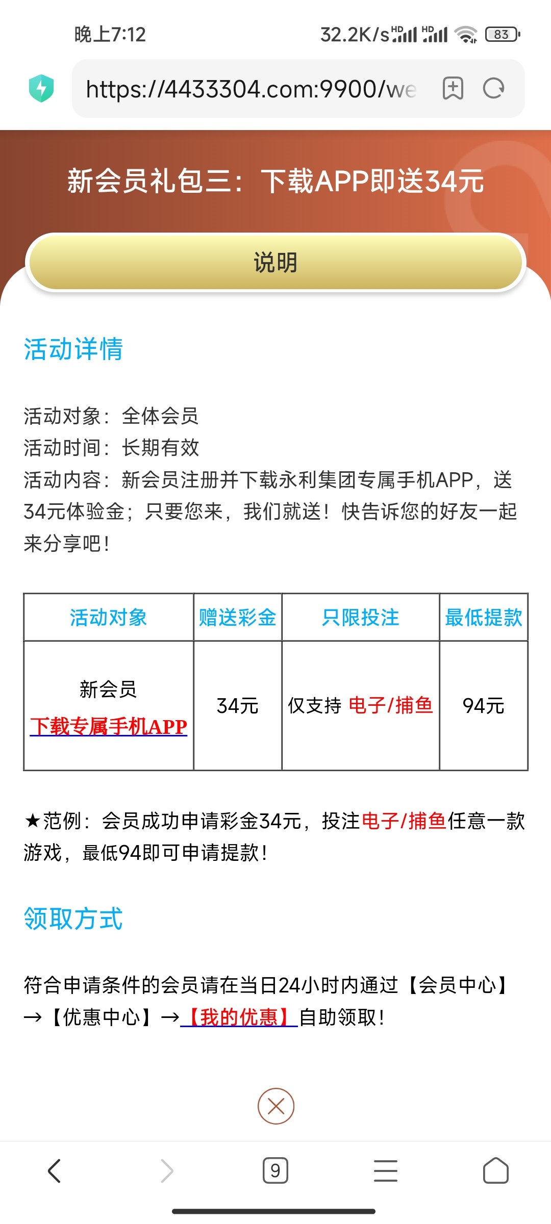 活动详情:下载APP注册完善信息去“我的优惠”自助申请34彩金,只能玩电子和捕鱼,打94提